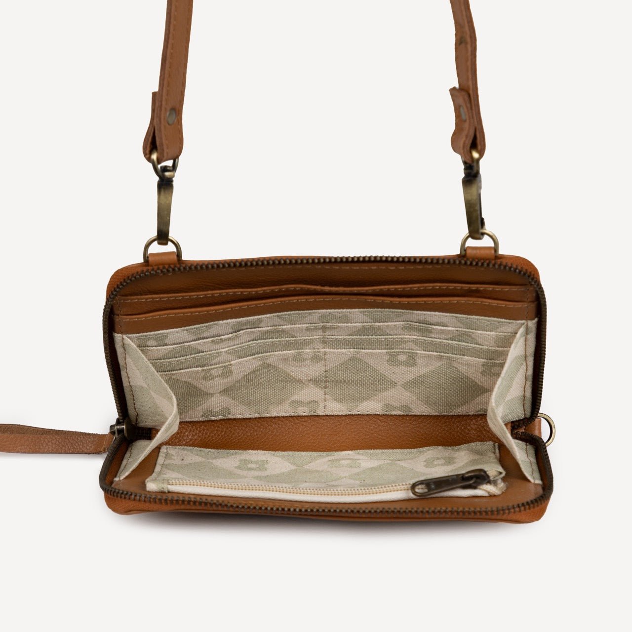 Cut, stitched, and finished by hand using traditional leatherwork techniques. Each bag takes several days to make; pattern cutting, hand-stitching, and finishing. We line the interior with hand block-printed cotton canvas, adding color and pattern inside. Every bag is signed by its maker.