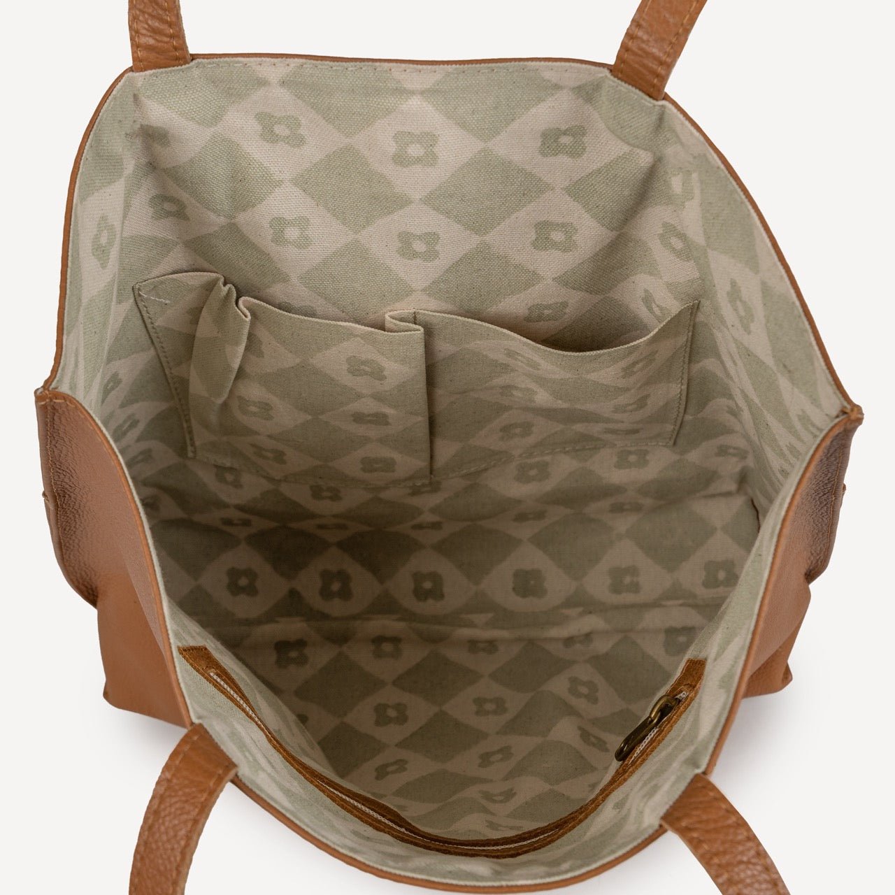 Cut, stitched, and finished by hand using traditional leatherwork techniques. Each bag takes several days to make; pattern cutting, hand-stitching, and finishing. We line the interior with hand block-printed cotton canvas, adding color and pattern inside. Every bag is signed by its maker.