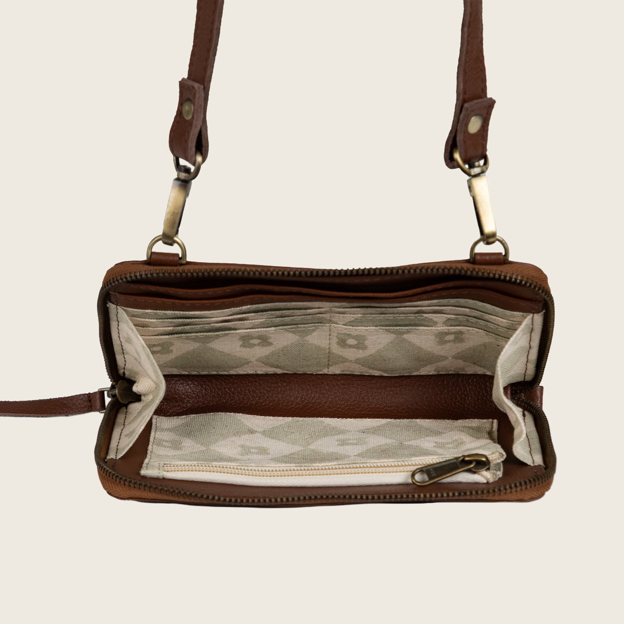Cut, stitched, and finished by hand using traditional leatherwork techniques. Each bag takes several days to make; pattern cutting, hand-stitching, and finishing. We line the interior with hand block-printed cotton canvas, adding color and pattern inside. Every bag is signed by its maker.