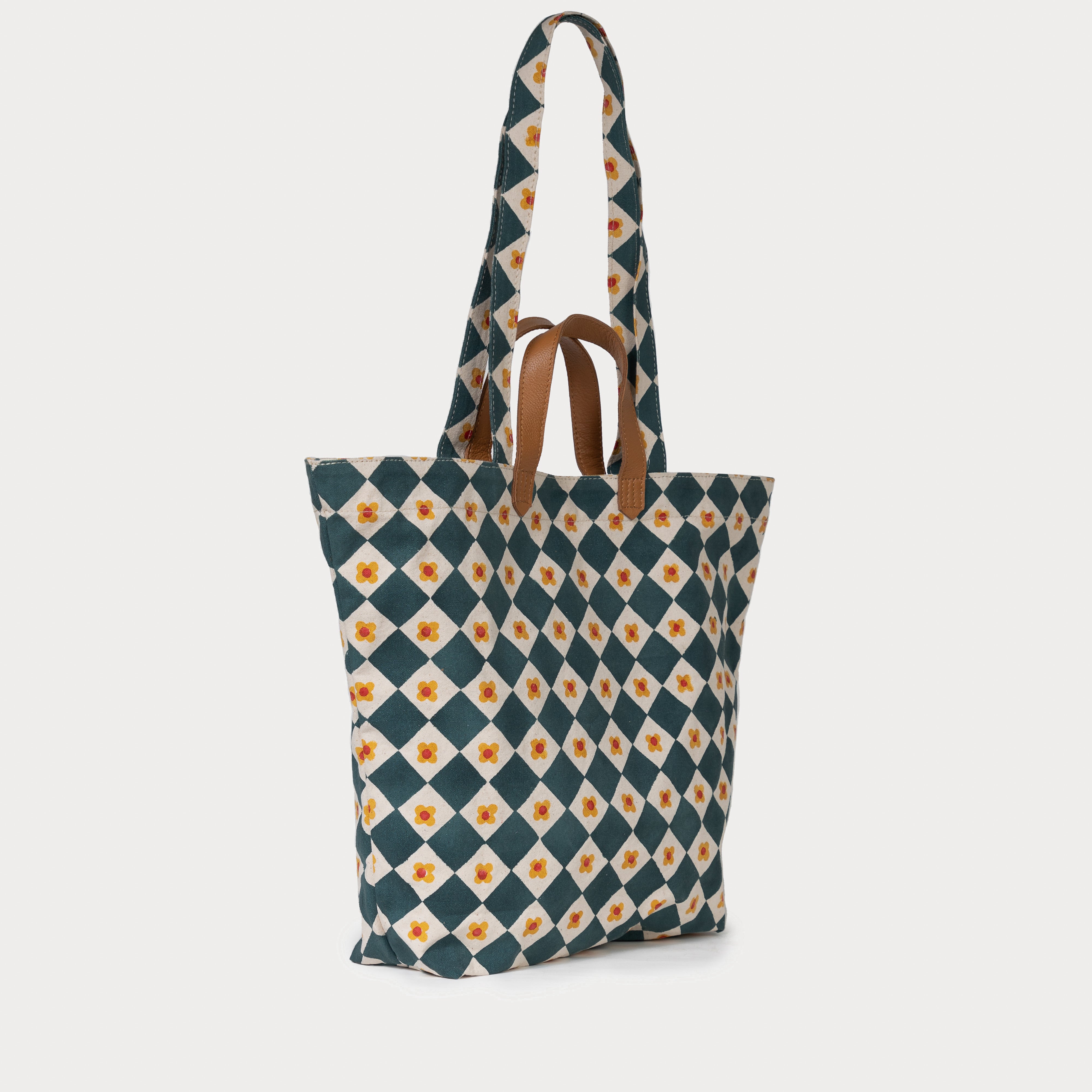 This print was designed by ceramic artist Toni Darling Frank, whose hand-painted ceramics transform everyday rituals into moments of joy. Her signature folk-inspired harlequin checks & daisies have been translated to canvas through traditional wood block printing.