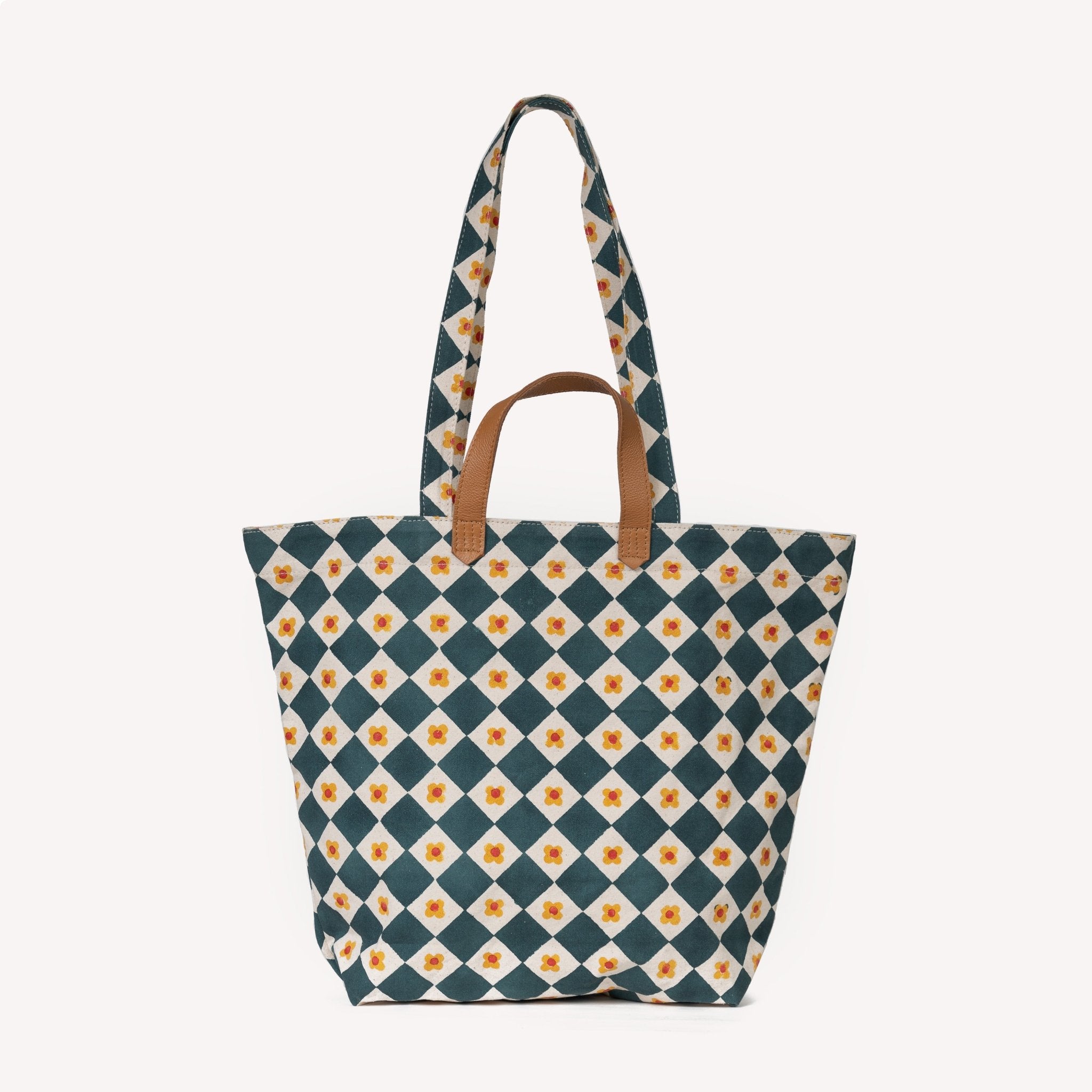 This print was designed by ceramic artist Toni Darling Frank, whose hand-painted ceramics transform everyday rituals into moments of joy. Her signature folk-inspired harlequin checks & daisies have been translated to canvas through traditional wood block printing.