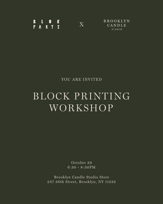Block Printing WorkshopLearn the art of wood block printing in Brooklyn Candle Studio's cosy space.LocationBrooklyn Candle Studio Store237 36th Street, Brooklyn, NY 11232Date & Time October 296:30 - 8:30PM